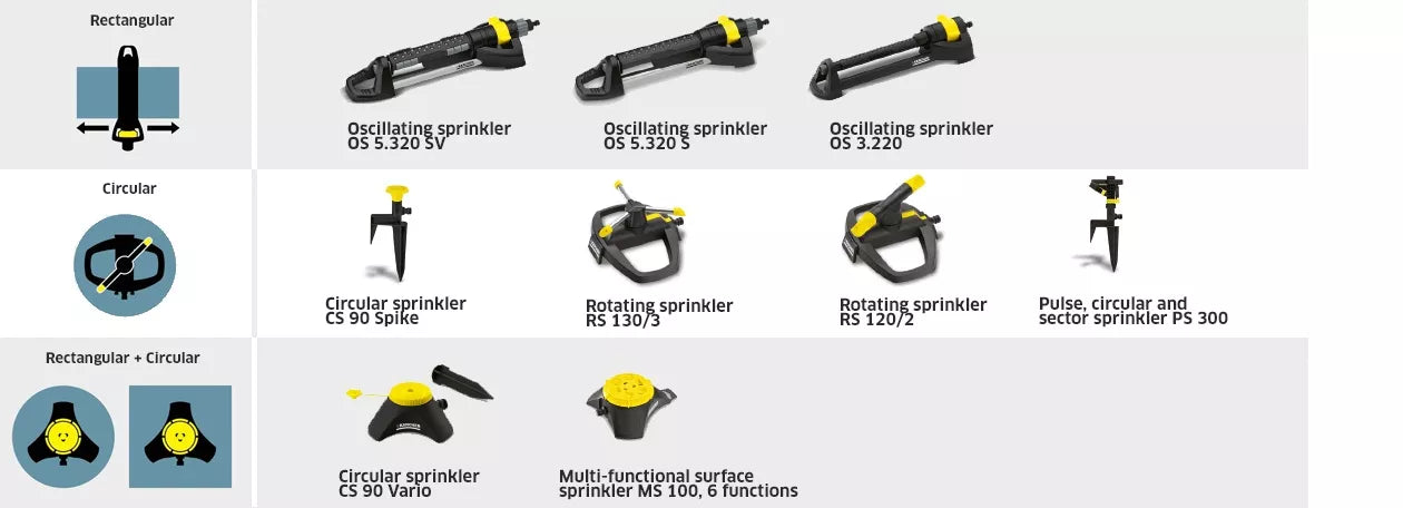 Sprinklers – տեխնոլոգիա, որը լի է հնարավորություններով: Kärcher շրջանաձև ջրցանների բազմազան տեսականին առաջարկում է կատարյալ լուծում յուրաքանչյուր այգու համար՝ մեծ, փոքր, հարթ կամ թեք: Karcher-ի նոր տատանվող հեղուկացիրներն դարձել են օգտագործման համար առավել պարզ։ Ներկառուցված պաշտպանիչ դետալը հարմարավետ կարգավորման և ուղղման համար տեղում առանց խոնավեցման։ Հեղուկացիրները հեշտությամբ միանում են այգու ռետինե խողովակներին։