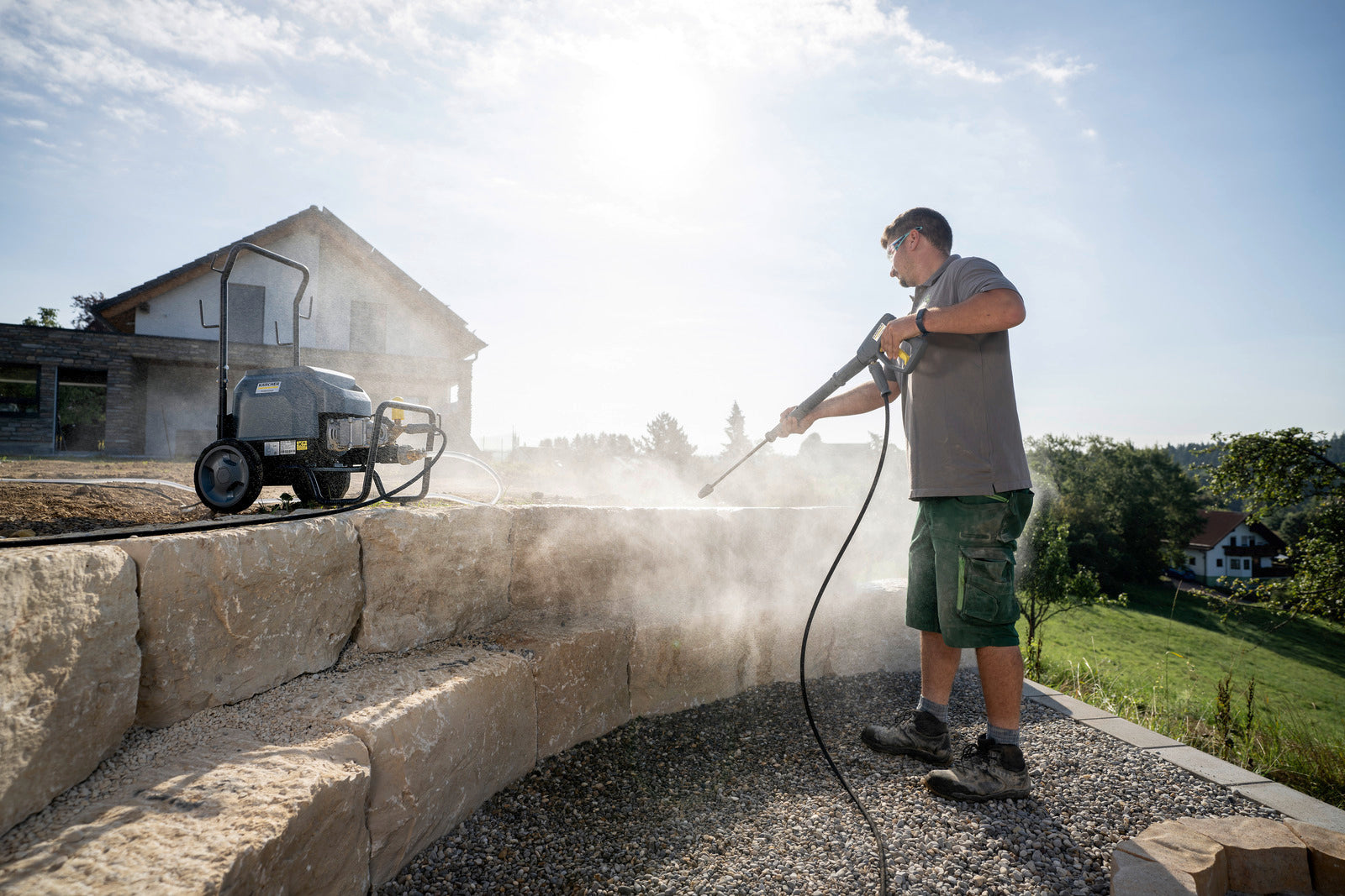 Robust, versatile high-pressure cleaner with steel frame, 4-pole low-speed motor, crankshaft pump with brass cylinder head for long downtime and low maintenance effort.
